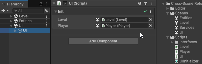 Cross-scene GameObject and component references can be assigned into Init fields of client components that have an initializer.