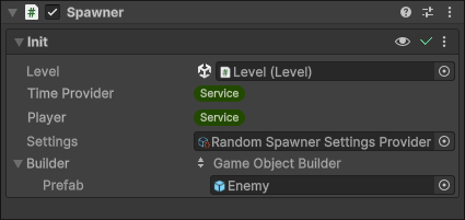 When you have a component that derives from MonoBehaviour<T…> or implements IInitializable<T…>, an Init section will automatically appear at the top of the components of that type in the Inspector.