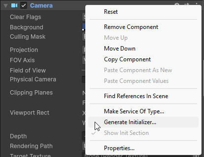 Another way that you can generate an initializer script for a component is by opening its context menu in the Inspector window and selecting Generate Initializer….